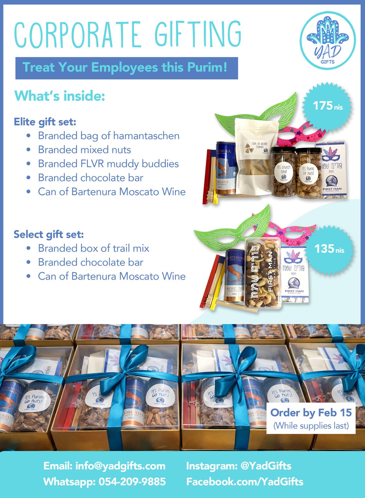 - Treat Your Employees this Purim! Corporate orders for Purim gift sets, with optional company branding on select items. Click here for more information