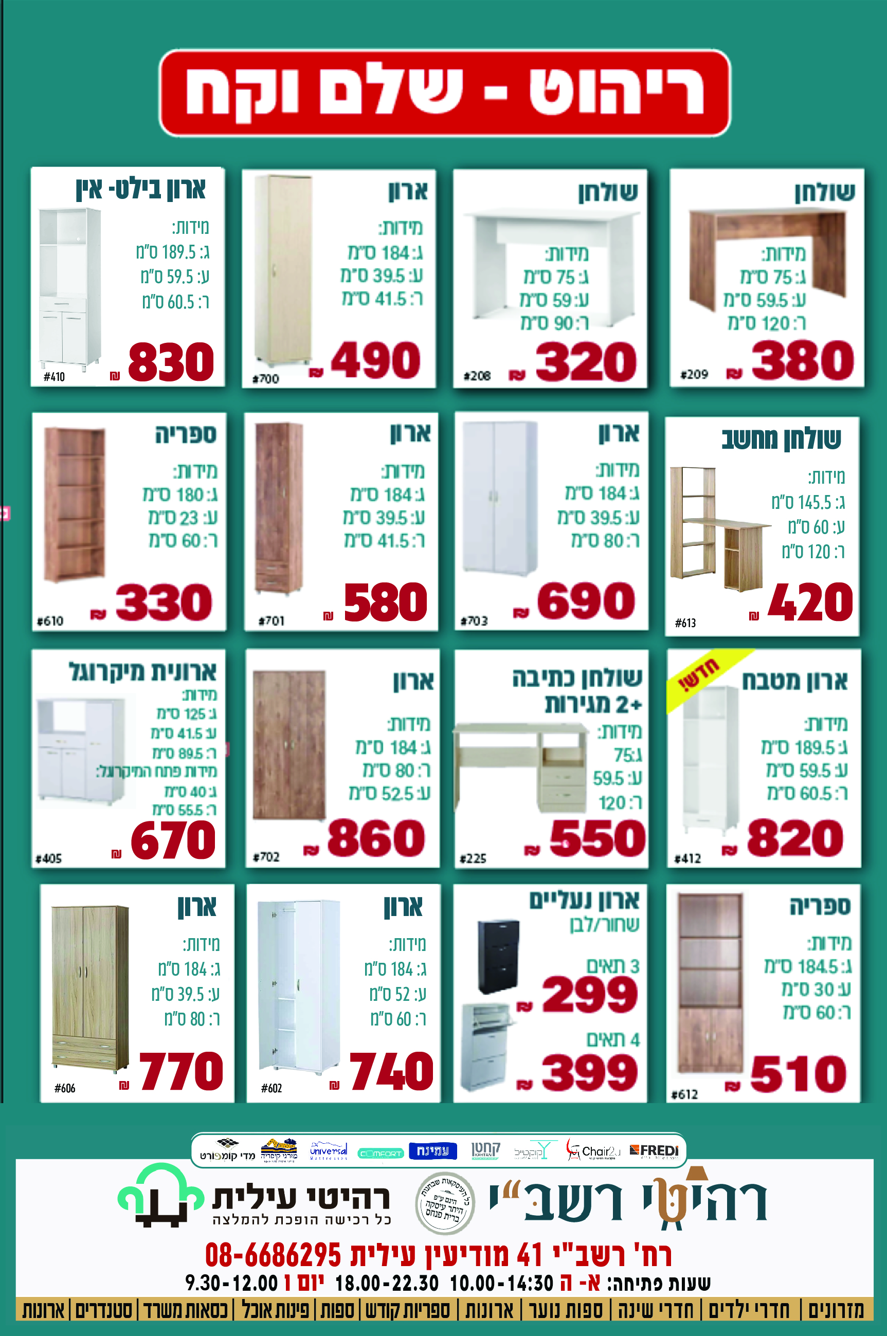 - פתרונות אחסון חכמים - ארונות, ספריות ושולחנות במחירים מיוחדים! החל מ-299 ₪ בלבד! לפרטים נוספים לחצו כאן